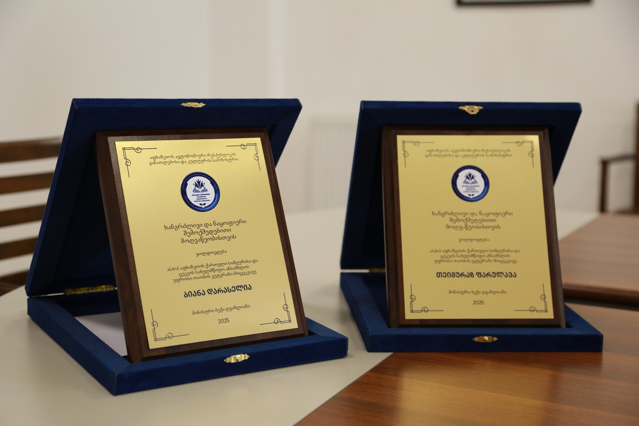 აფხაზეთის ავტონომიური რესპუბლიკის განათლებისა და კულტურის მინისტრმა ბექა ღვაჩლიანმა აფხაზეთის ქართული სიმღერისა და ცეკვის ანსამბლის უფროსი თაობის ვეტერანი მოცეკვავეები ბიანა დარასელია და თეიმურაზ ფარულავა, ქართულ-აფხაზურ კულტურულ ურთიერთობებში შეტანილი წვლილისათვის და მრავალწლიანი ნაყოფიერი მოღვაწეობისათვის მადლობის სიგელითა და სიმბოლური საჩუქრებით დააჯილდოვა.