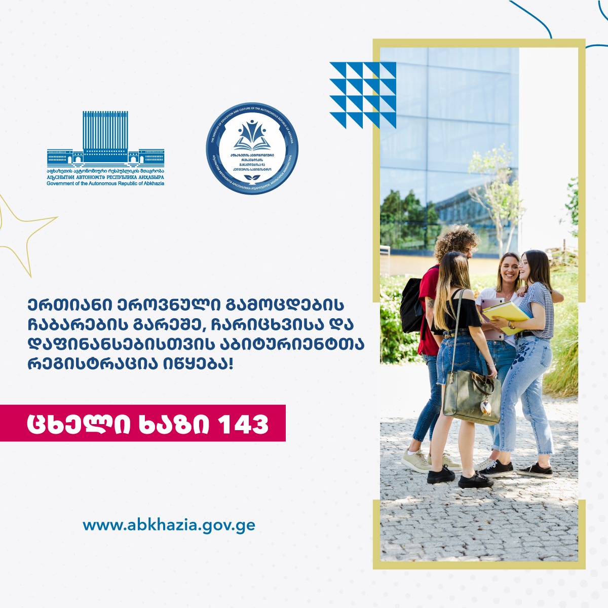 "ერთიანი ეროვნული გამოცდების გარეშე ჩარიცხვისა და დაფინანსების წესის" დამტკიცების თაობაზე საქართველოს განათლების, მეცნიერების, კულტურისა და სპორტის მინისტრის 2020 წლის 7 ივლისის №77/ნ ბრძანების შესაბამისად, აფხაზეთის ა/რ განათლებისა და კულტურის სამინისტრო აფხაზეთის ა/რ ოკუპირებულ ტერიტორიაზე მყოფი აბიტურიენტების რეგისტრაციას იწყებს.