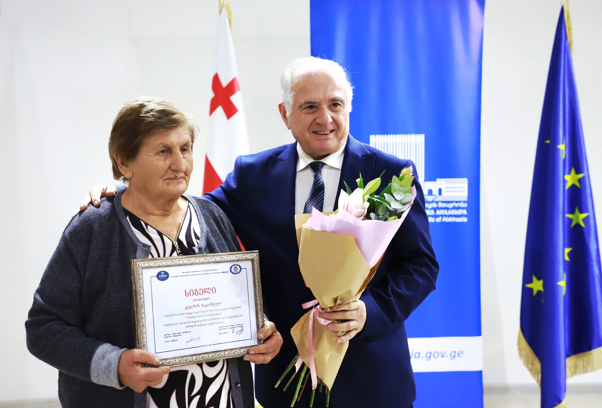ღონისძიებაზე აფხაზეთის ავტონომიური რესპუბლიკის ღვაწლმოსილი პედაგოგები ეთერი ლაშხია, გულნაზ ბაციაშვილი, მზიანა ბოკუჩავა, ზაირა გვაგვალია, მანანა გიორხელიძე, ნანული ჯახუა და თინათინ კალანდია ასევე, აფხაზეთის საჯარო სკოლების 2025 სასწავლო წლის საუკეთესო მასწავლებლები ირმა კილასონია, თეა კუხიანიძე და ნინო ფარულავა სამინისტროს სიგელებითა და საჩუქრებით დაჯილდოვდნენ.