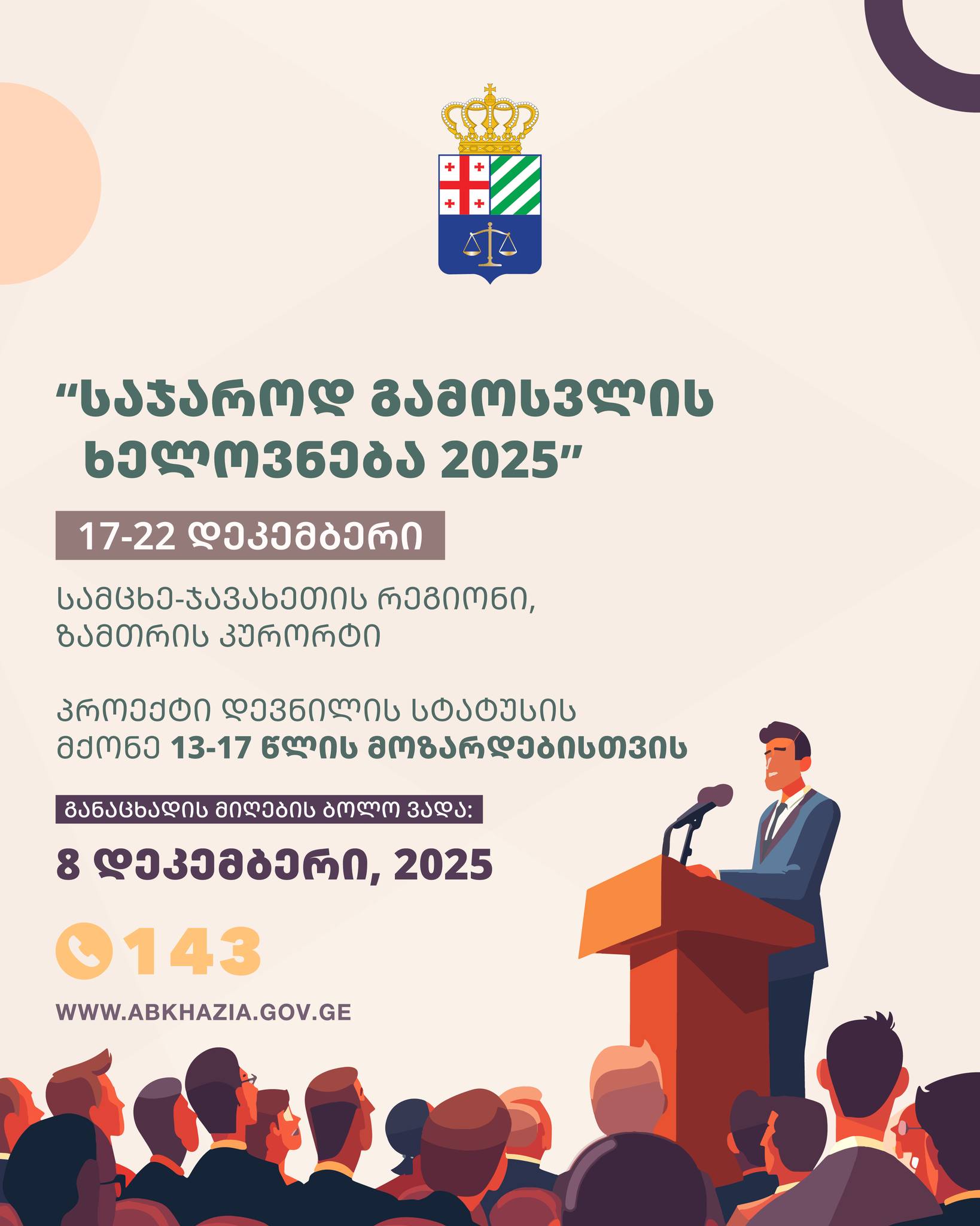 აფხაზეთის ავტონომიური რესპუბლიკის იუსტიციისა და სამოქალაქო ინტეგრაციის სამინისტრო იწყებს საგანმანათლებლო პროექტს - ,,საჯაროდ გამოსვლის ხელოვნება 2025”, რომელიც მიზნად ისახავს მონაწილეებში ეფექტური კომუნიკაციისა და საჯარო გამოსვლის უნარების ჩამოყალიბებას, ინტეგრაციისა და სოციალიზაციის ხელშეწყობას, გუნდური მუშაობის უნარების გაძლიერებას.