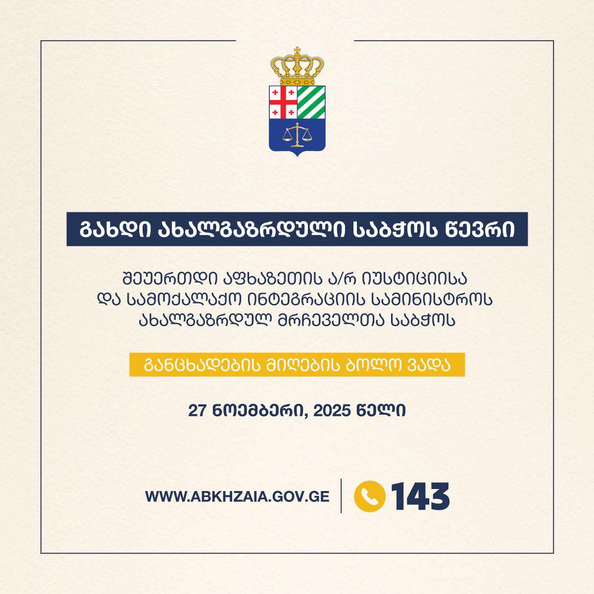 აფხაზეთის ავტონომიური რესპუბლიკის იუსტიციისა და სამოქალაქო ინტეგრაციის სამინისტრო აცხადებს კონკურსს ახალგაზრდული მრჩეველთა საბჭოს წევრების შესარჩევად