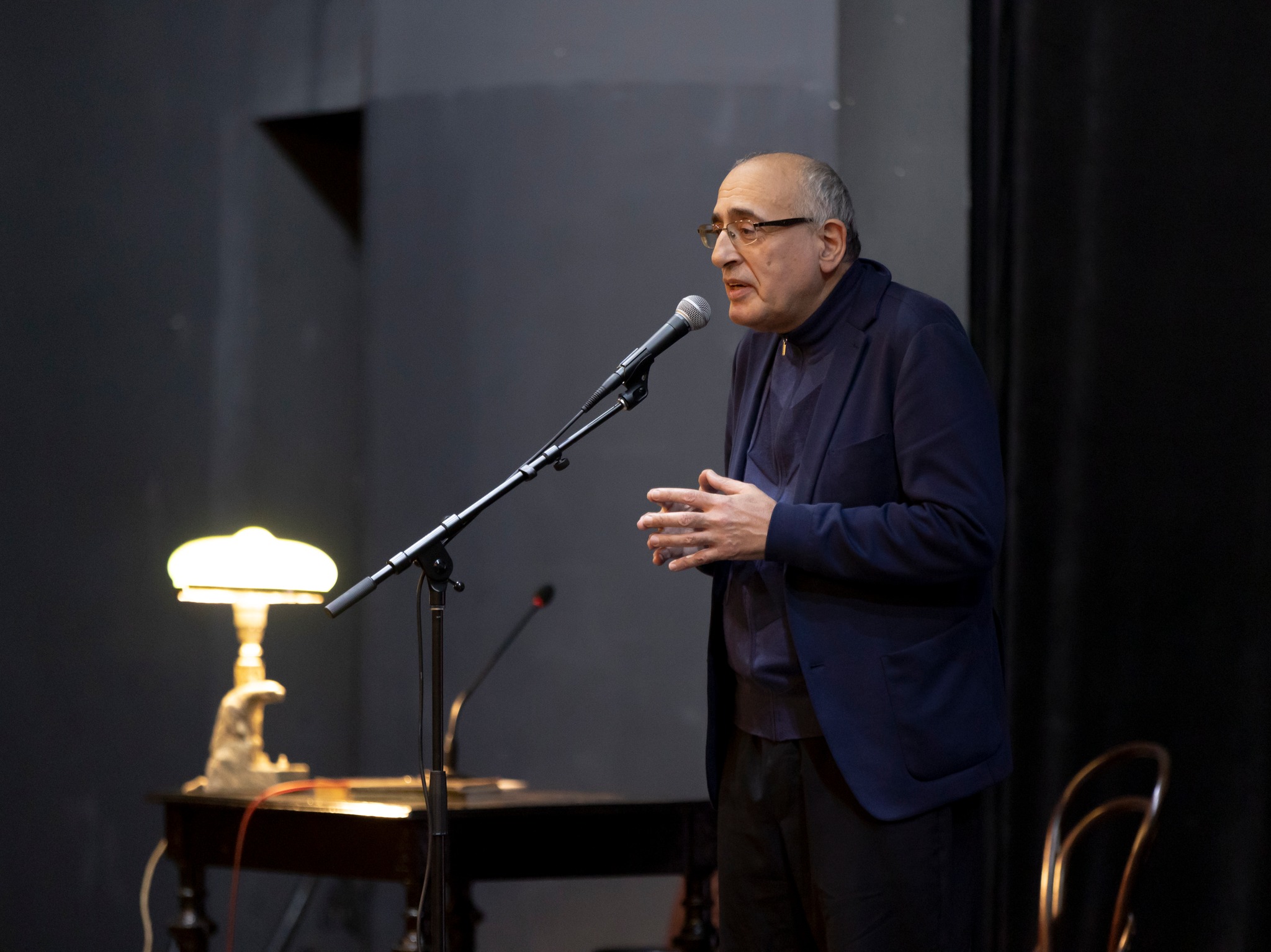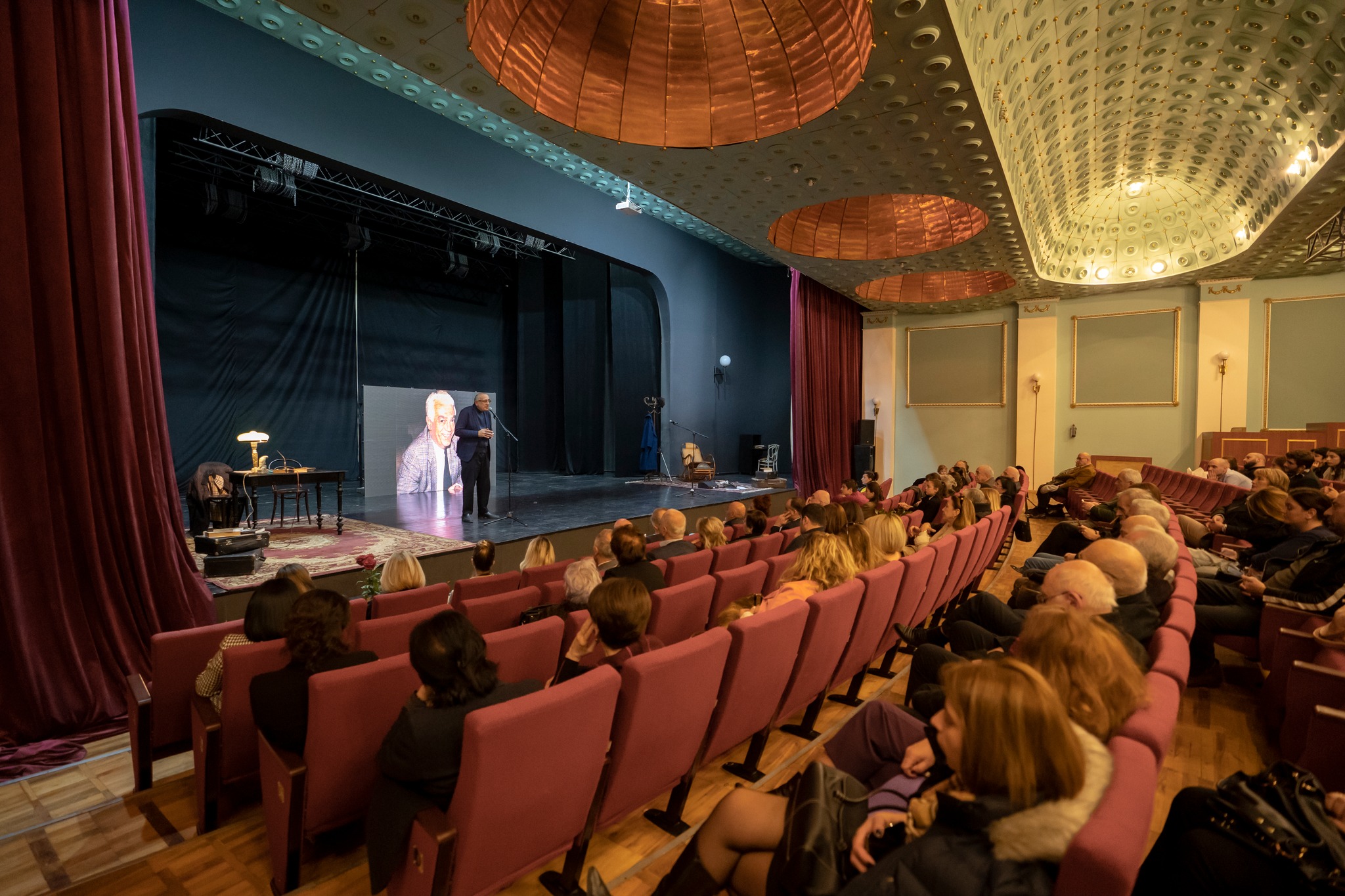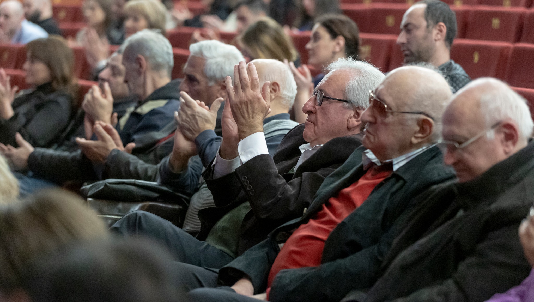 ეკრანზე ნაჩვენები იყო გენო კალანდიას ცხოვრებისა და შემოქმედების ამსახველი ფოტო და ვიდეოკოლაჟი.