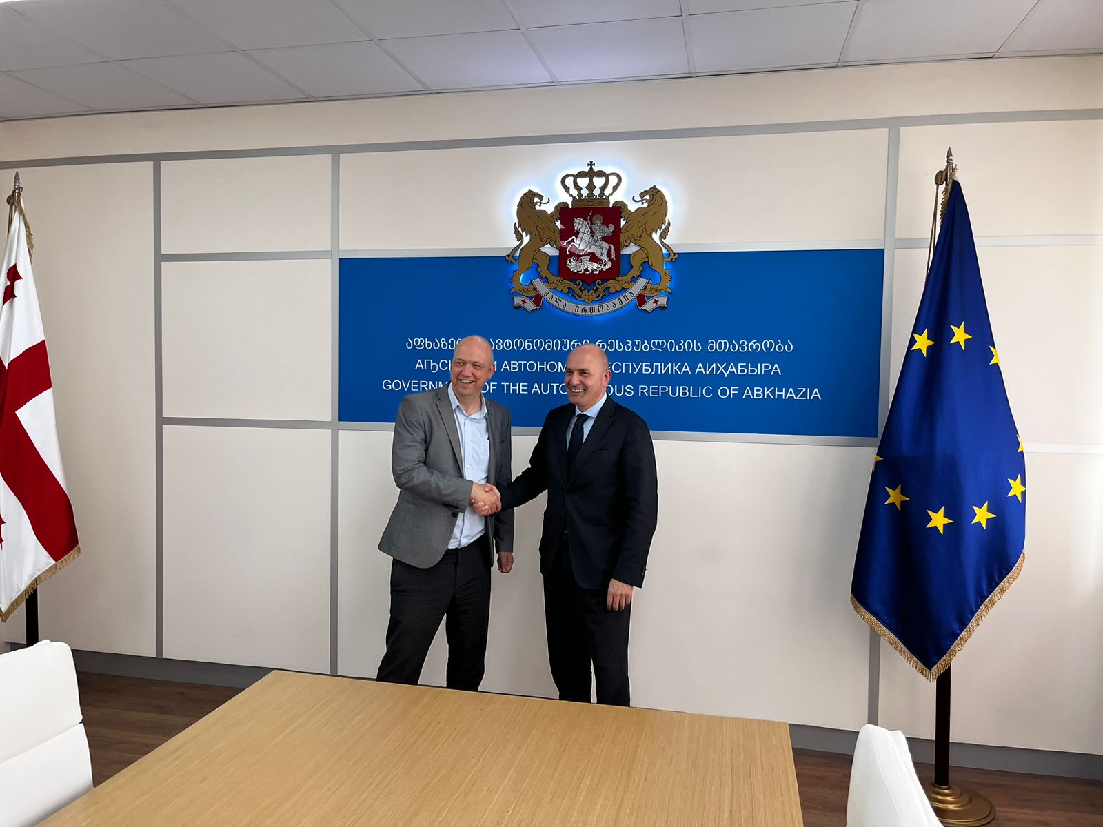 აფხაზეთის ავტონომიური რესპუბლიკის მთავრობის თავმჯდომარე რუსლან აბაშიძე, იუსტიციისა და სამოქალაქო ინტეგრაციის საკითხებში აფხაზეთის ავტონომიური რესპუბლიკის მინისტრ გიორგი გაბედავასთან ერთად, კემბრიჯის უნივერსიტეტის ევროპასა და ცენტრალურ აზიაში საგანმანათლებლო რეფორმებისა და პარტნიორობის მიმართულების ხელმძღვანელ სტივენ კინგს შეხვდა.