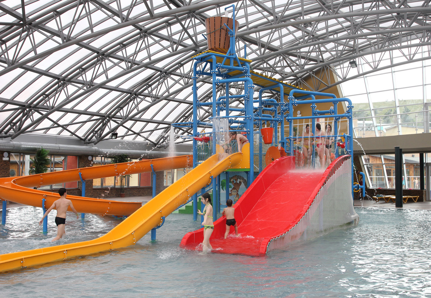 ღია და დახურული აუზების გარდა, „ჯინო პარადაისის" კომპლექსში სხვადასხვა წყლის ატრაქციონებზე დევნილმა ბავშვებმა მთელ დღე ხალსიანად გაატარეს.
