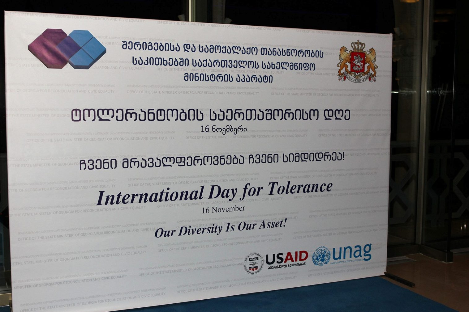 ტოლერანტობის საერთაშორისო დღესთან დაკავშირებით, 16 ნოემბერს, შერიგებისა და სამოქალაქო თანასწორობის საკითხებში საქართველოს სახელმწიფო მინისტრის აპარატის ორგანიზებით ოფიციალური მიღება გამართა. მოწვეულ სტუმრებს სახელმწიფო მინისტრმა ქეთევან ციხელაშვილმა უმასპინძლა.