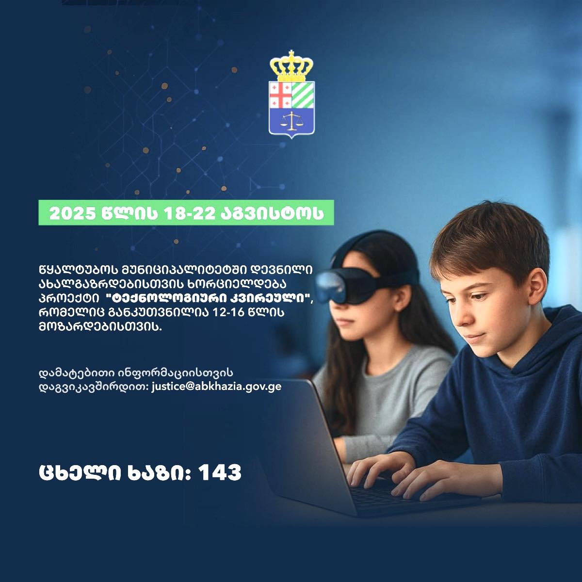აფხაზეთის ავტონომიური რესპუბლიკის იუსტიციისა და სამოქალაქო ინტეგრაციის სამინისტრო იწყებს საგანმანათლებლო პროექტს – "ტექნოლოგიური კვირეული“, რომელიც მიზნად ისახავს ოკუპირებულ აფხაზეთში ლეგიტიმურად მცხოვრები, ან დევნილის სტატუსის მქონე 12-16 წლის ახალგაზრდების სოციალურ ინტეგრაციასა და სამოქალაქო ცნობიერების ამაღლებას.