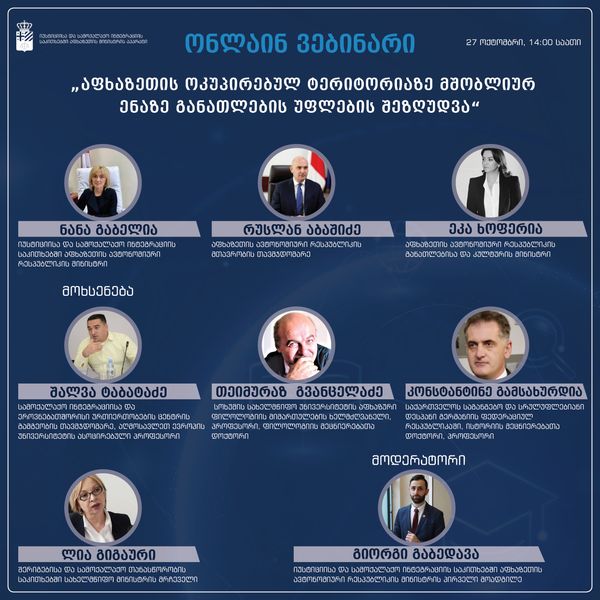 იუსტიციისა და სამოქალაქო ინტეგრაციის საკითხებში აფხაზეთის ავტონომიური რესპუბლიკის მინისტრის აპარატი აფხაზური ენის დაცვის დღესთან დაკავშირებით მიმდინარე წლის 27 ოქტომბერს, 14:00 საათზე ატარებს ვებინარს თემაზე „აფხაზეთის ოკუპირებულ ტერიტორიაზე მშობლიურ ენაზე განათლების უფლების შეზღუდვა“.